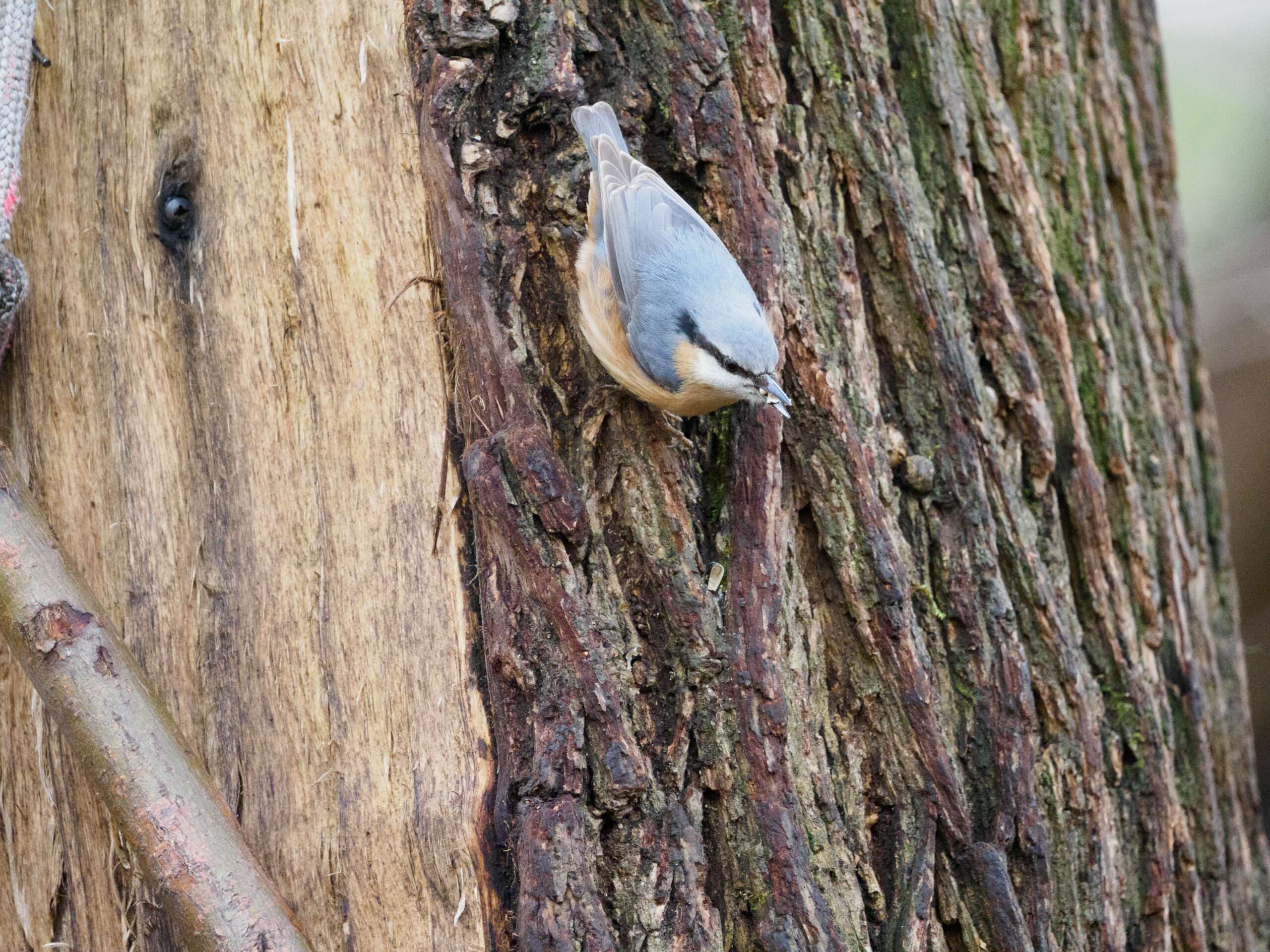 Ein Kleiber klammert sich an einem Baustamm und hält Ausschau.