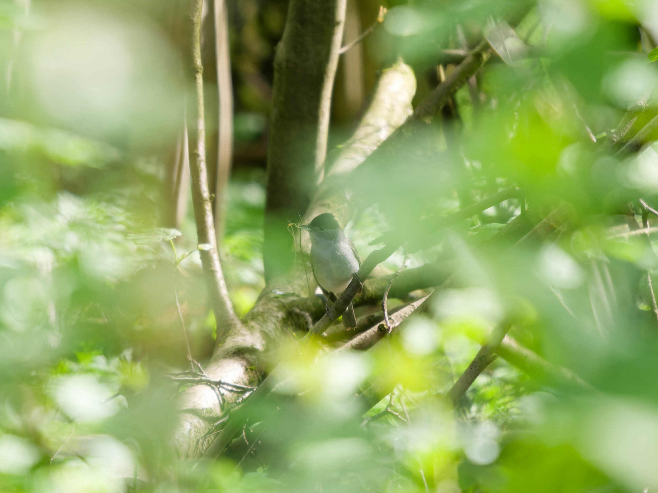 Eine Mönchsgrasmücke besorgt Nistmaterial. Sie sitzt nahe am Waldboden.