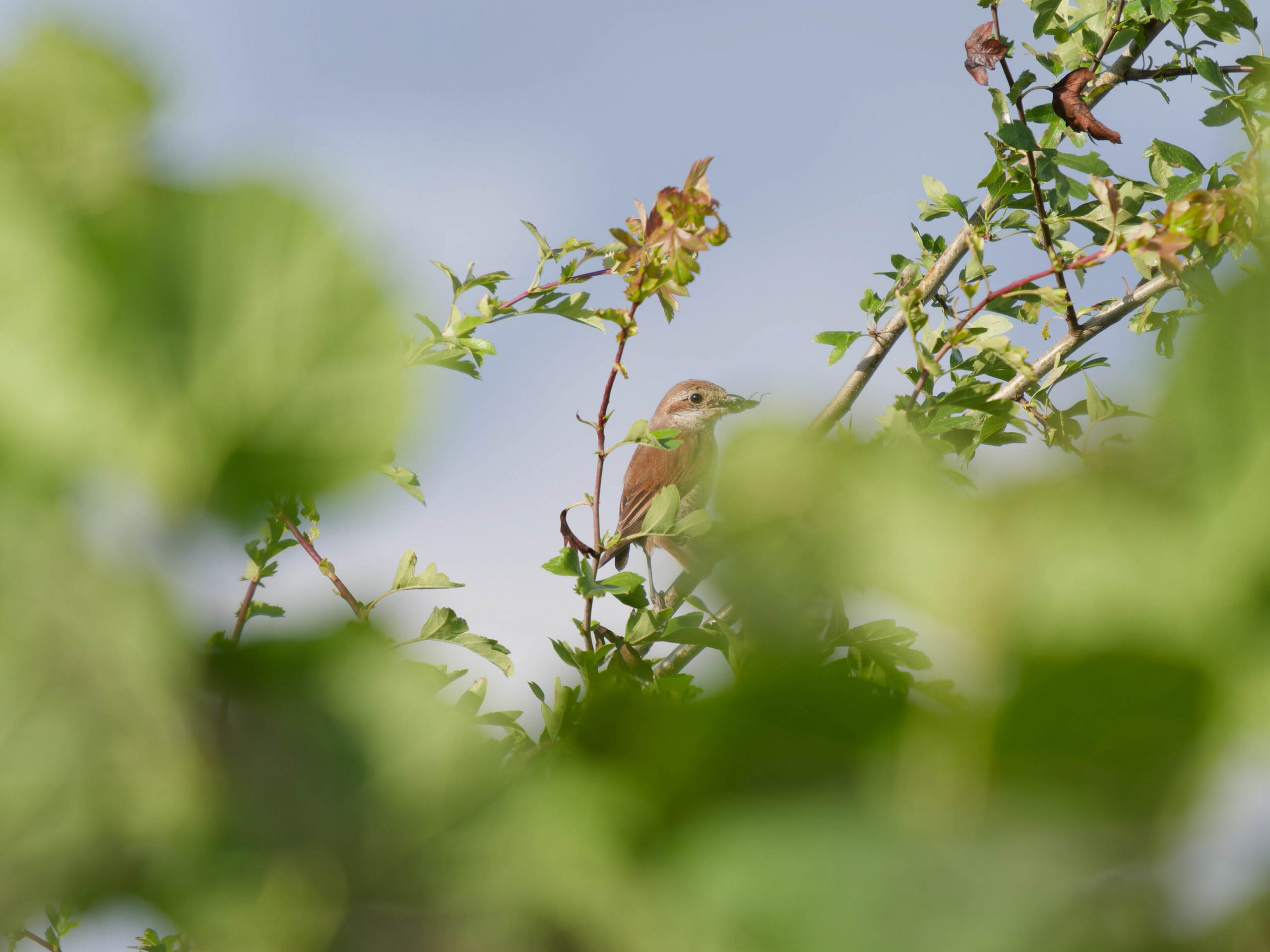 Ein Neuntöter sitzt ein einem Busch. Er hat ein Insekt in seinem kräftigen Schnabel.