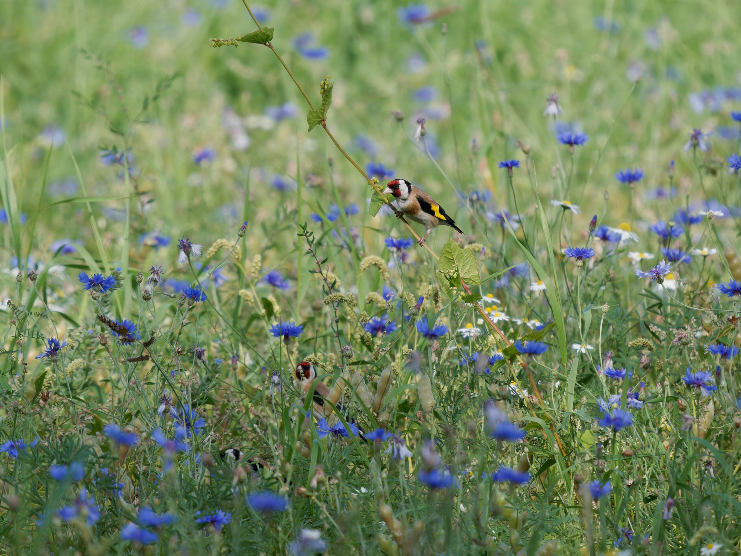 Ein Stieglitz sitzt auf einem Halm, über die blauen Kornblumen einer Brachwiese herausragend. In den Kornblumen ist noch ein weiterer Stieglitz zu sehen.