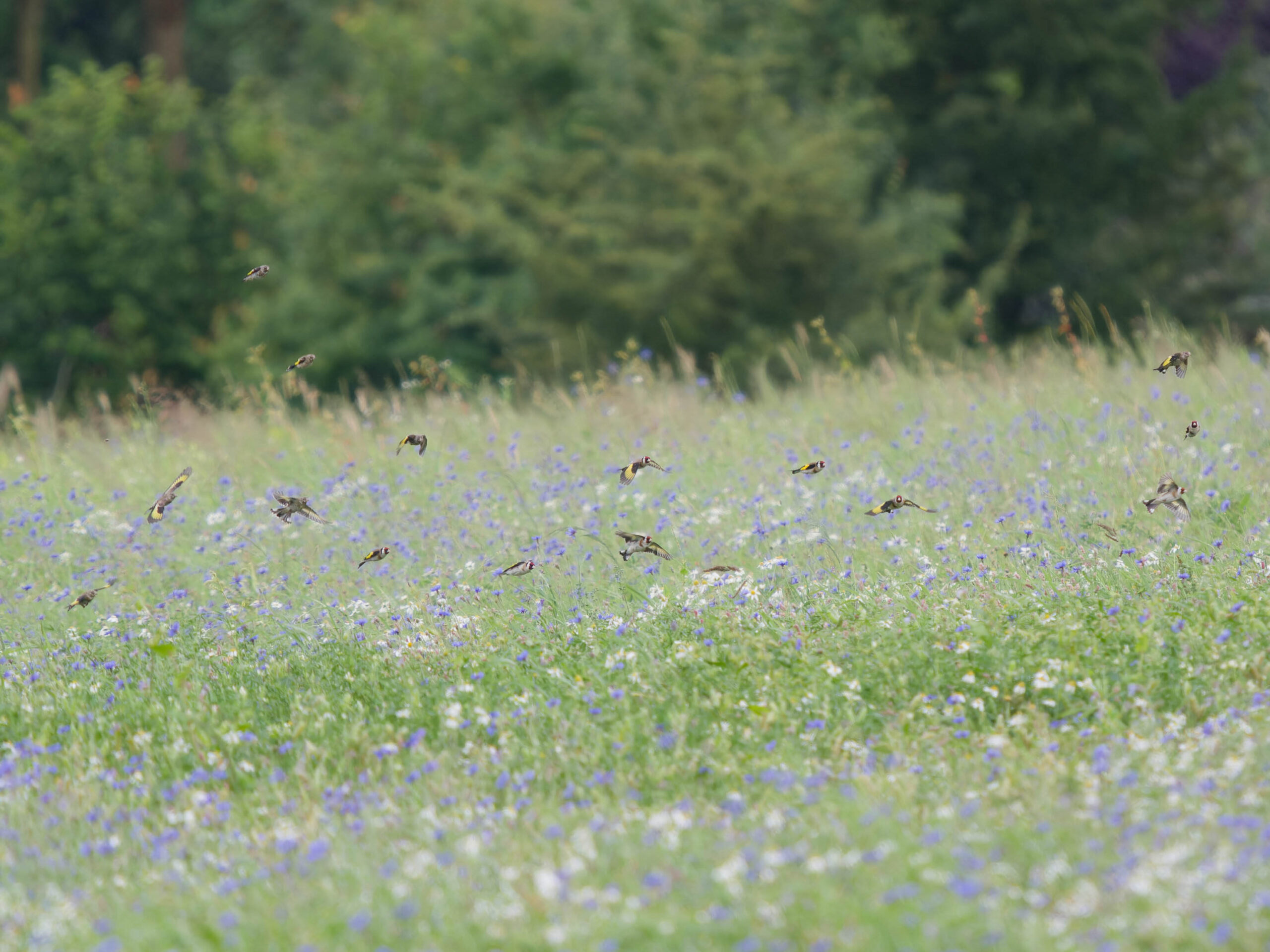 Ein Schwarm von ausgewachsenen Stieglitzen und Jungvögeln fliegt über eine Kornblumenwiese.