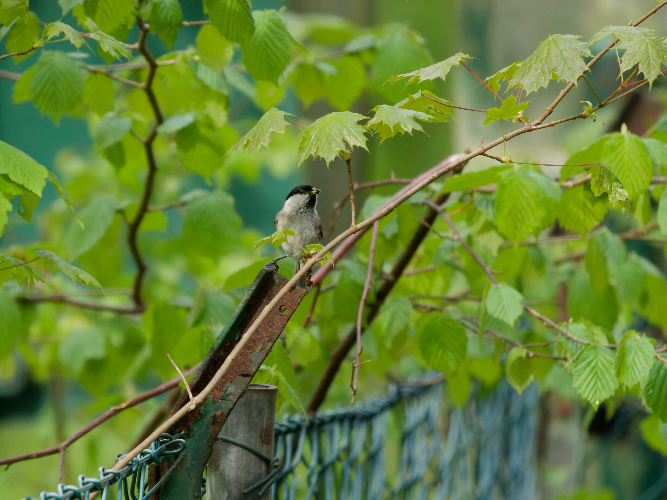 Die Sumpfmeise sitz auf einem Zaun. Sie frisst an einem Blatt, hält aber inne.