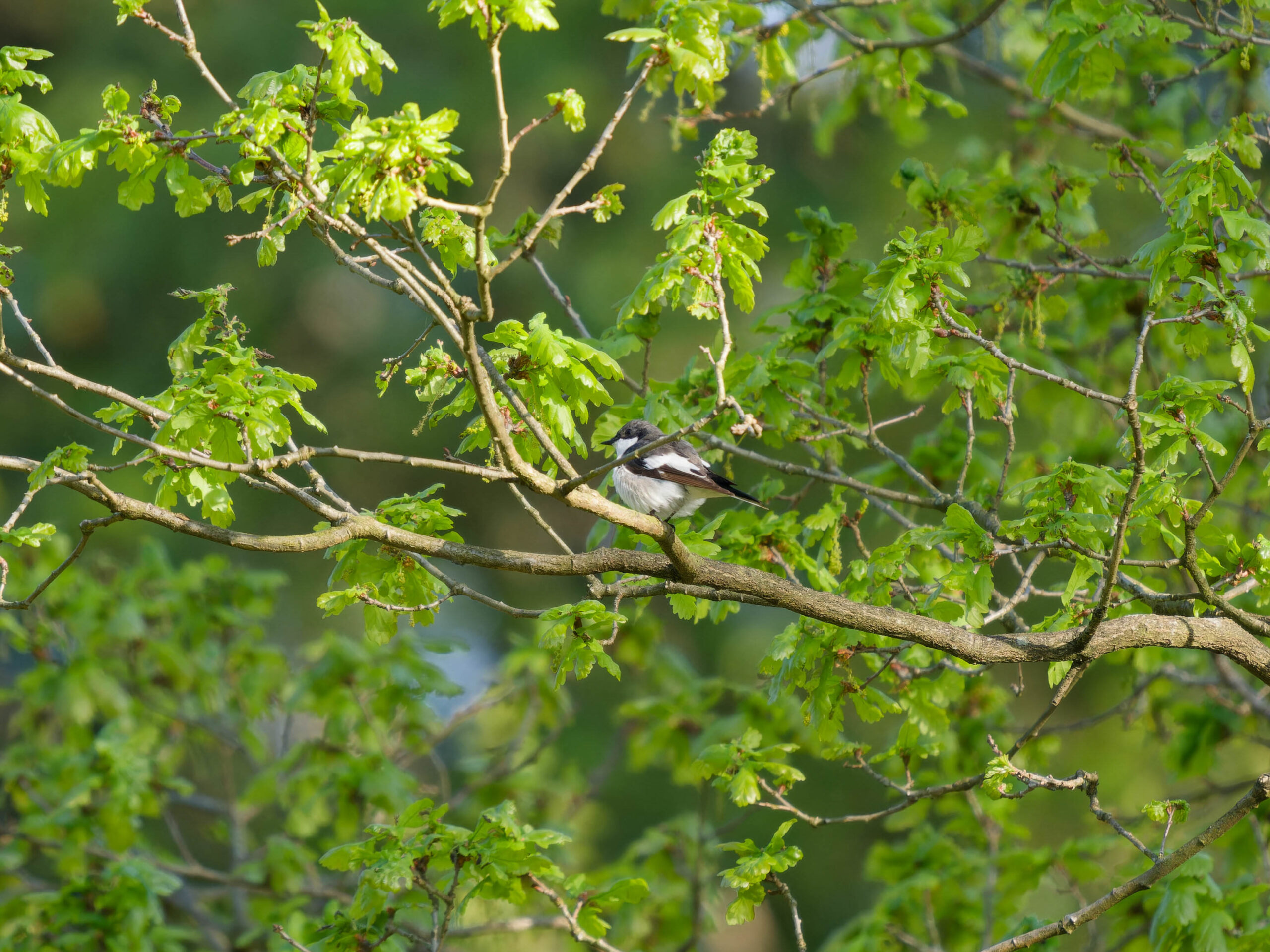 Ein Trauerschnäpper sitzt auf einem Baumast.