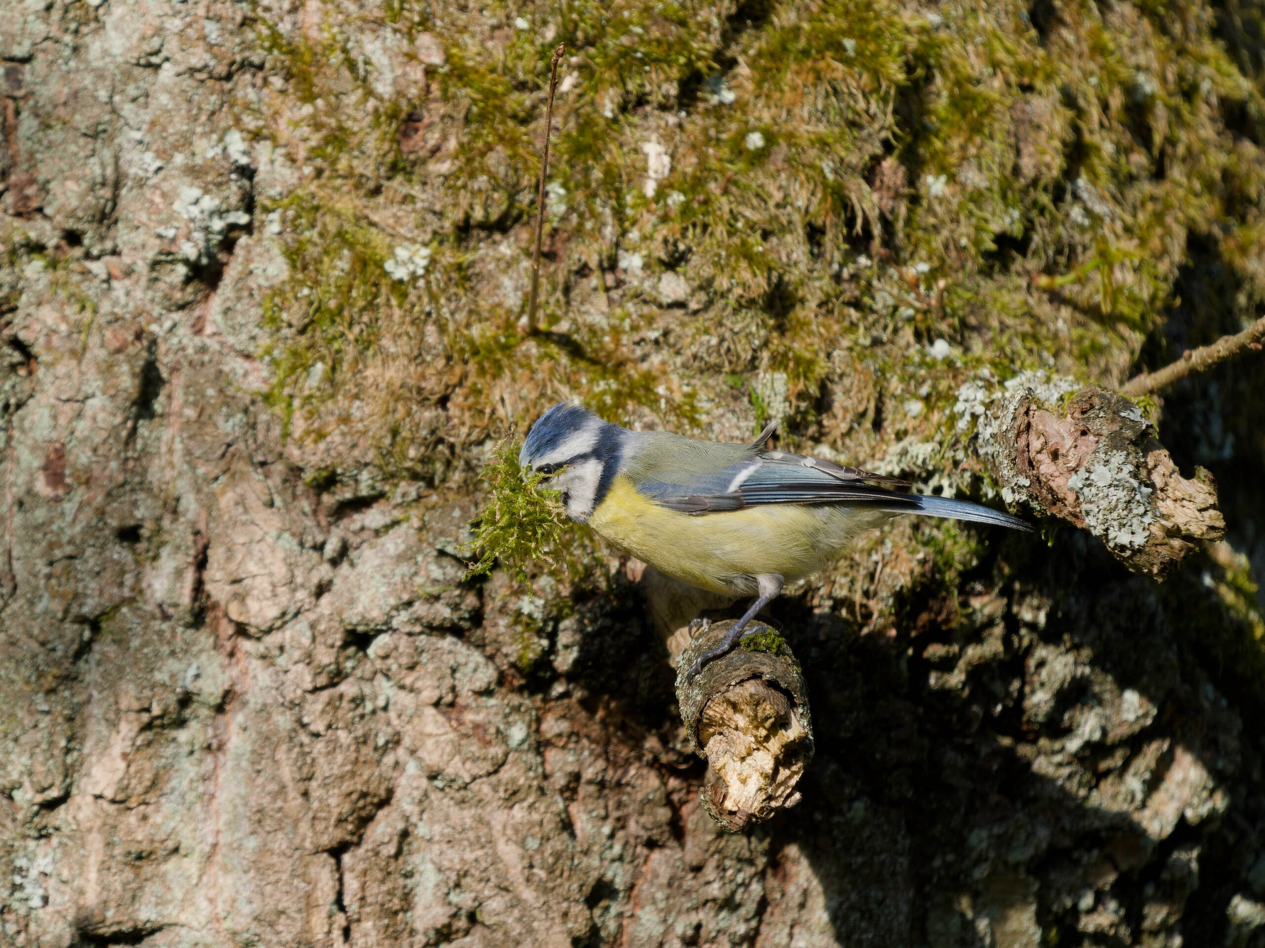 Eine Blaumeise kümmert sich um Nistmaterial. Sie sitzt auf einem Aststumpf eines bemossten Baumes.