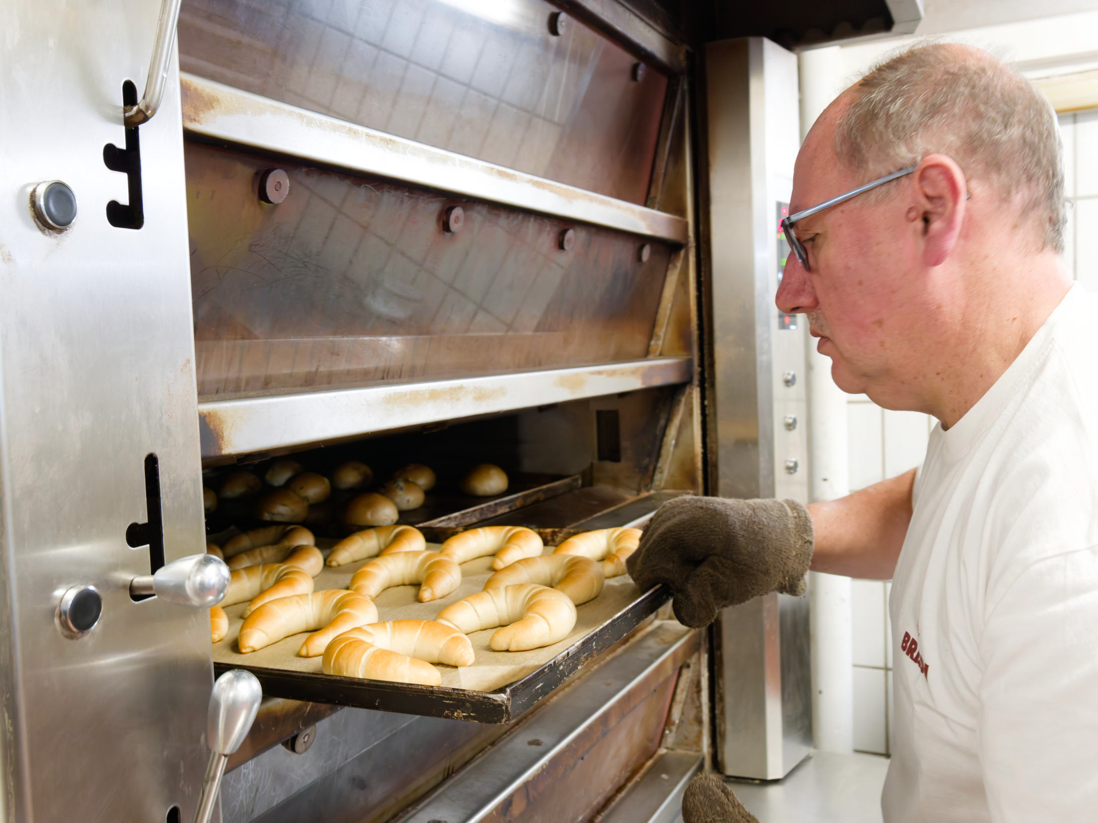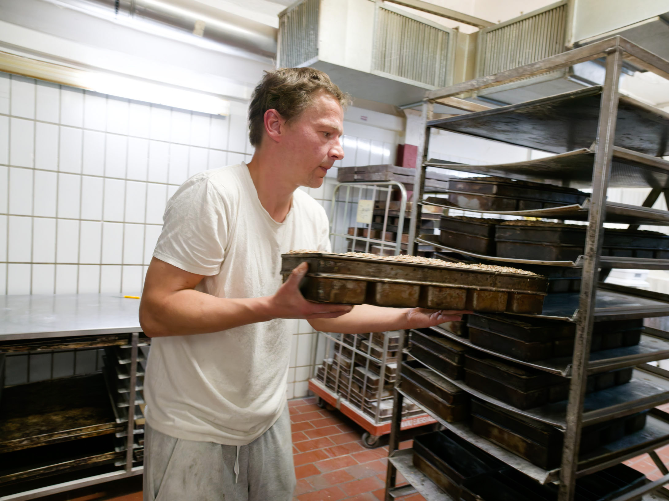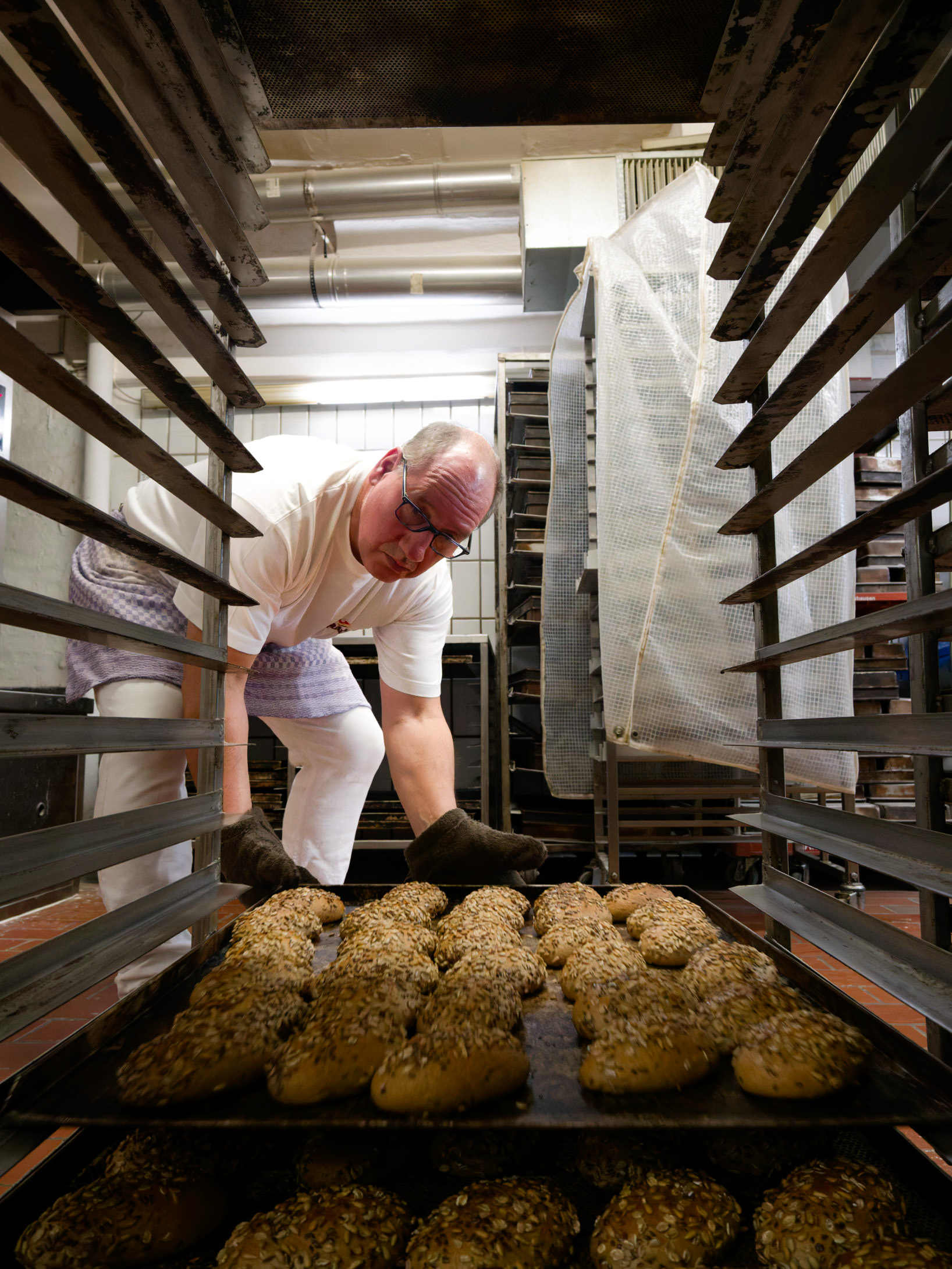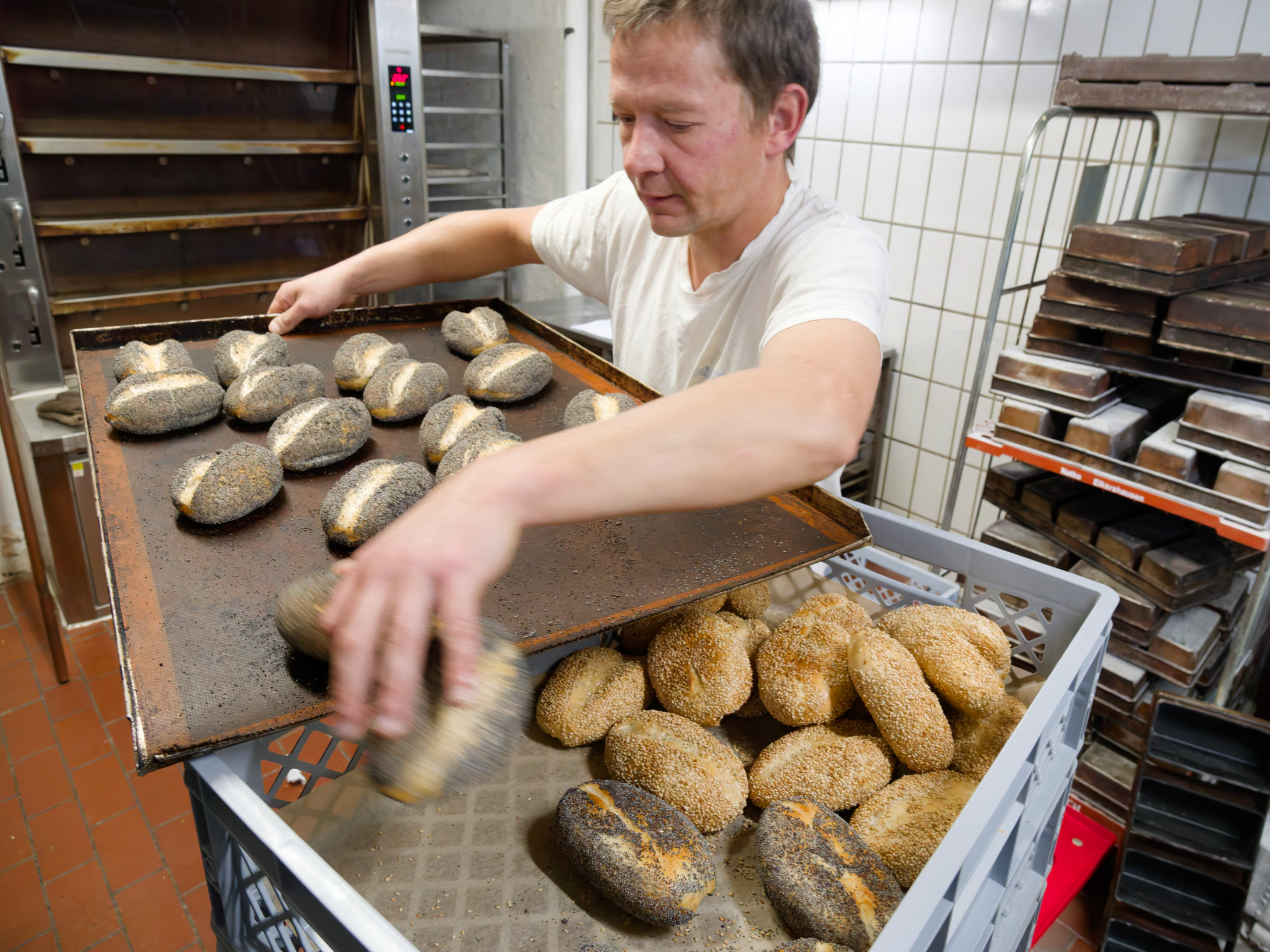 Der Bäcker schiebt das Bleck mit den noch heißen Mehrkornbrötchen zum Abkühlen in den Bäckereiwagen.