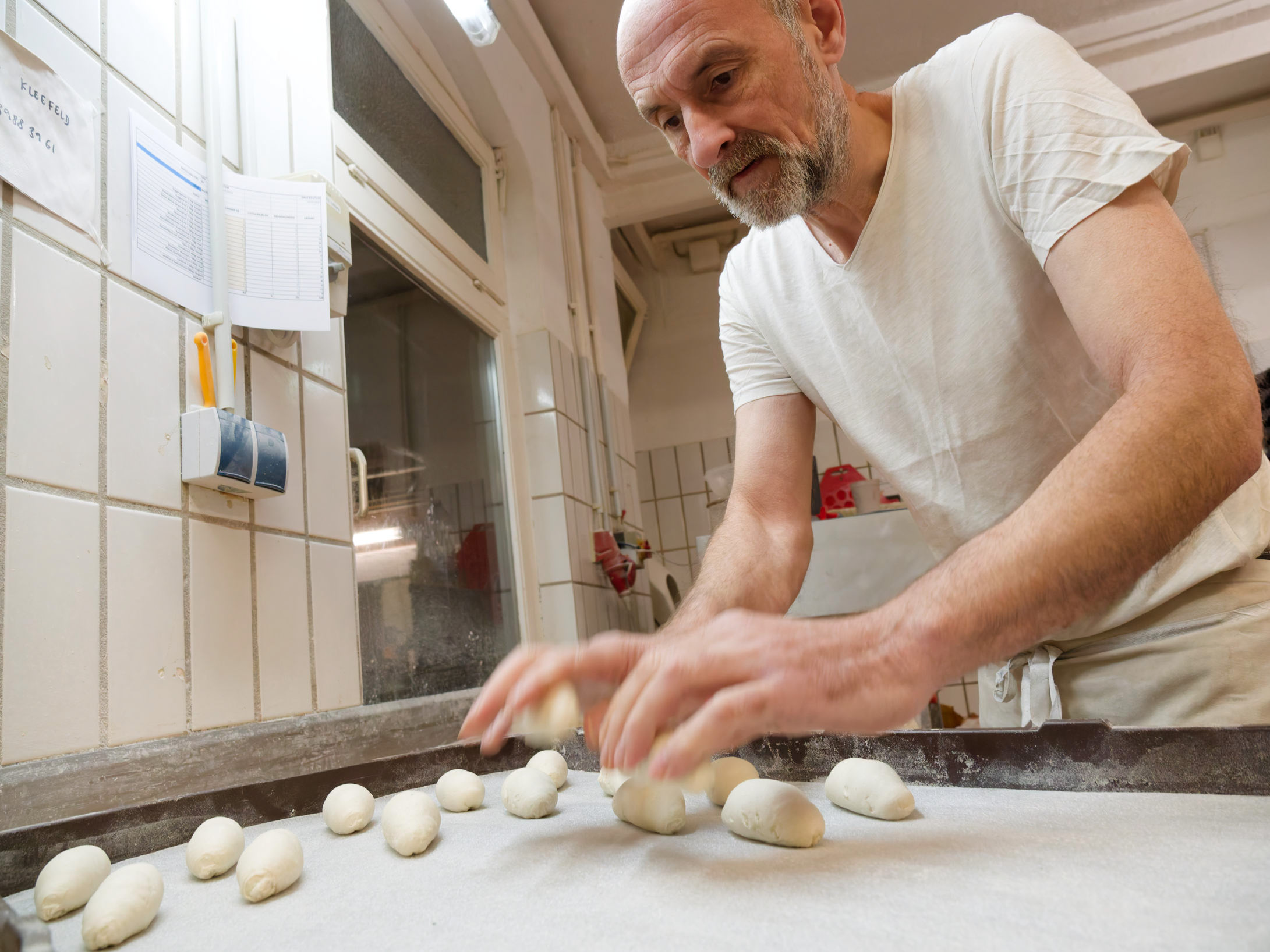 Mit Leichtigkeit lässt der Bäcker die zukünftigen Mandelrollen auf das Backblech fallen, vorher gerollt.