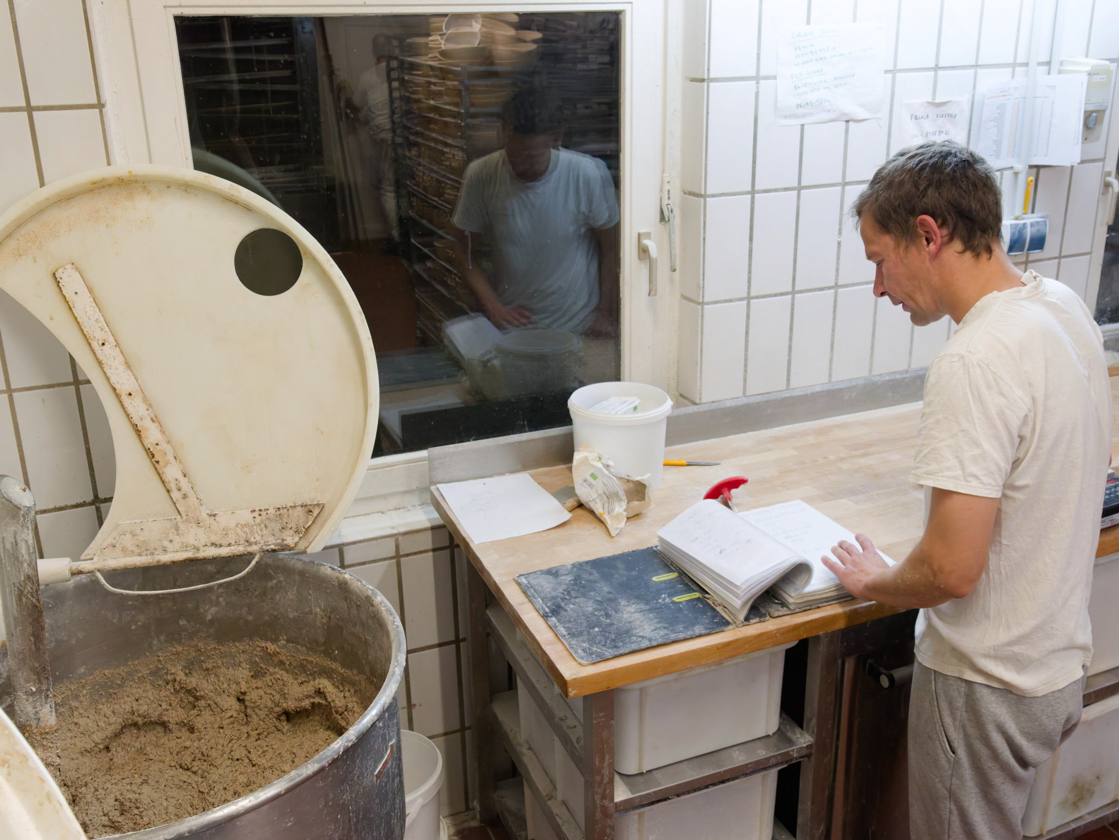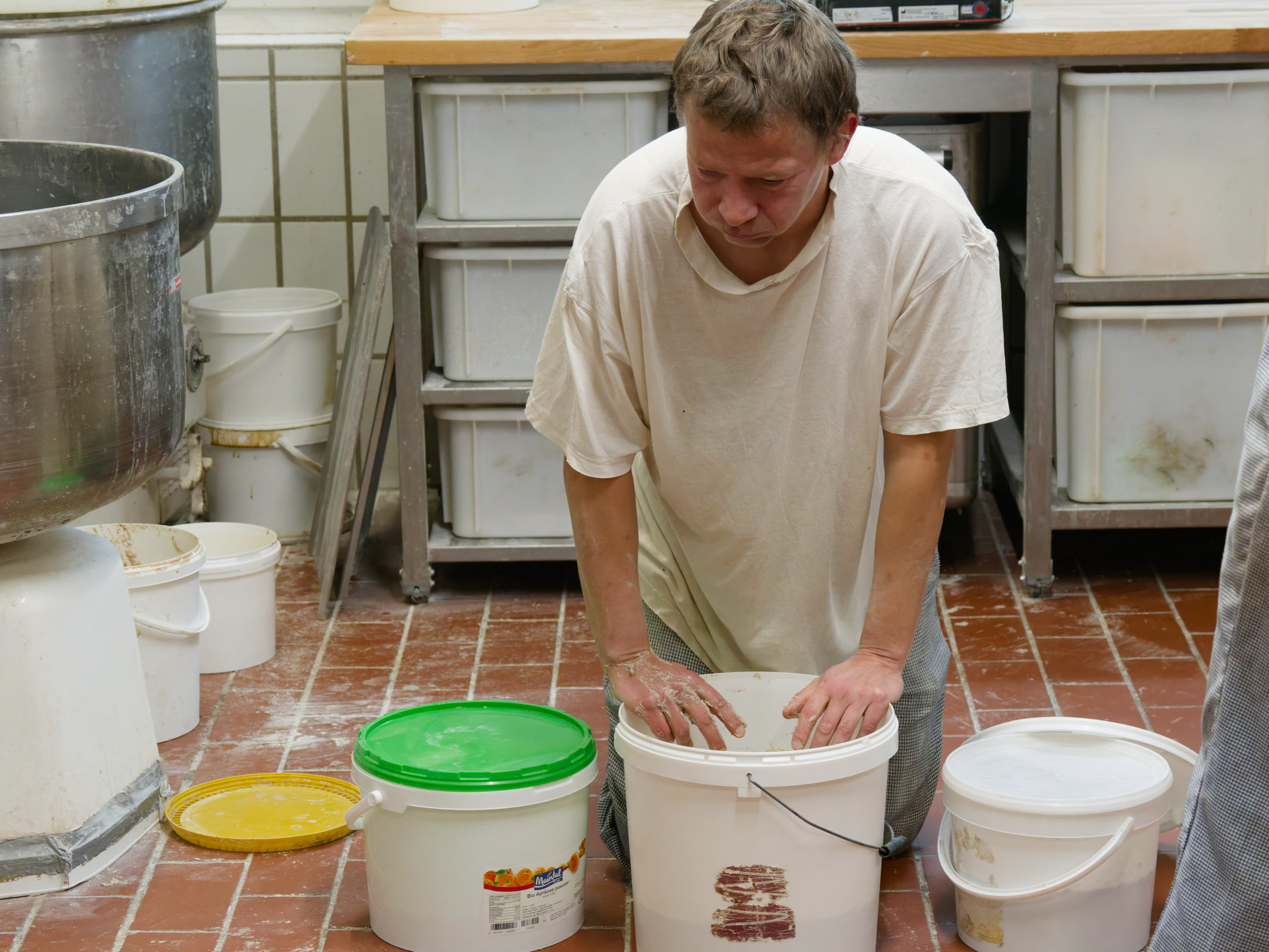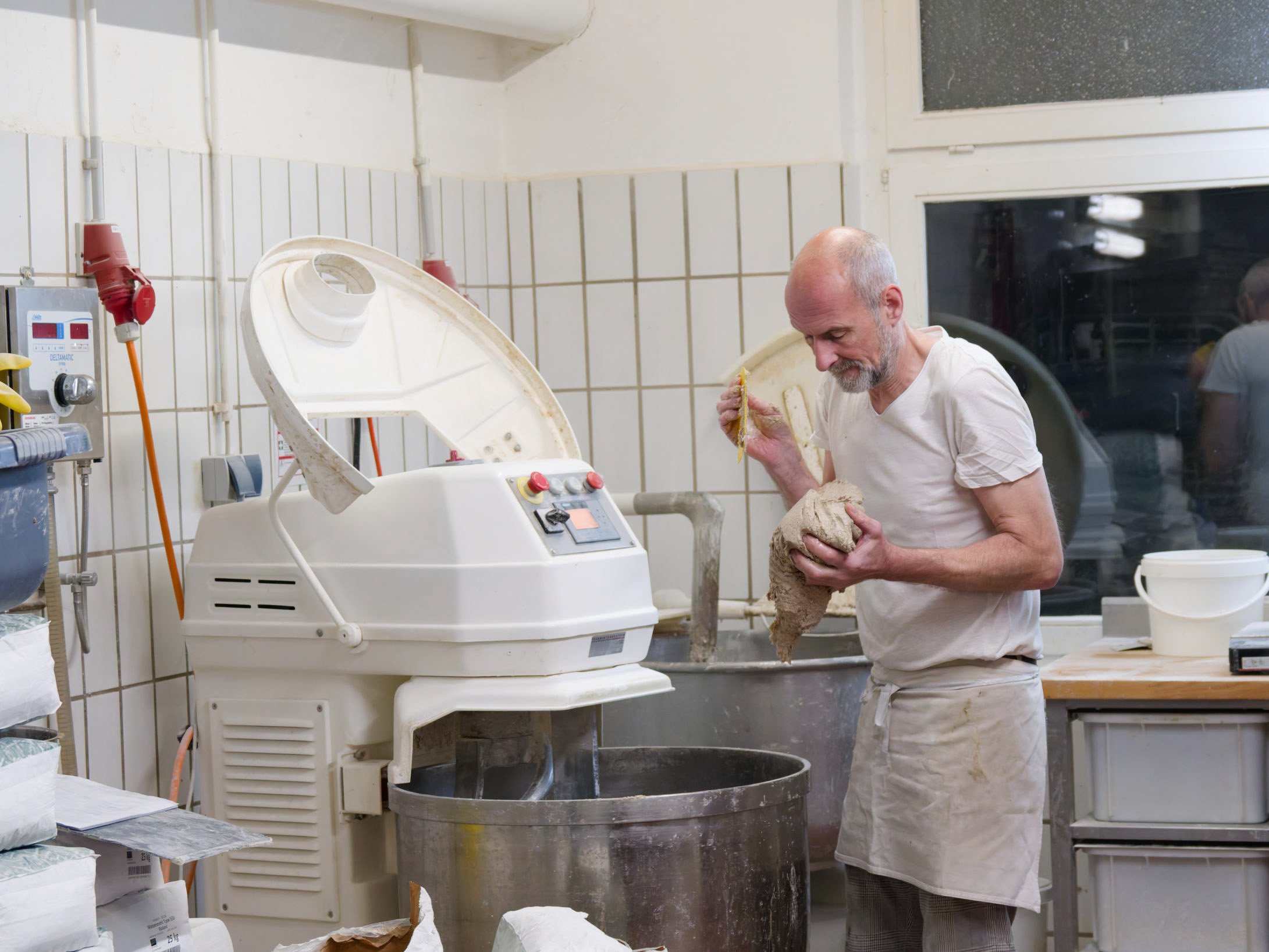 Der Bäcker bereitet ein kleine Menge Teig vor. Der Einsatz von Maschinen ist hier nicht angebracht.