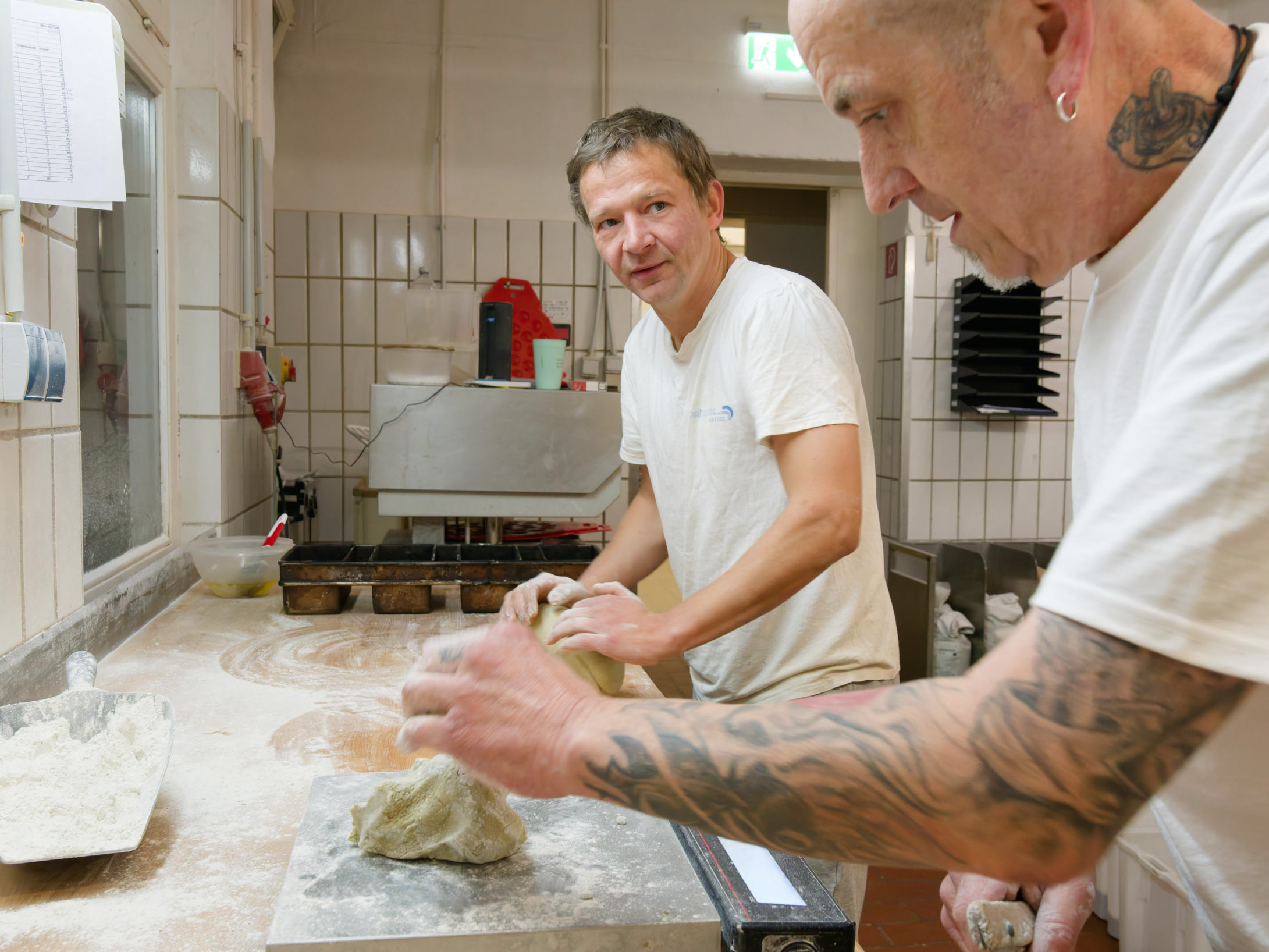 Das Portionieren für einen Brotteigling mit einer geeichten Waage. Je erfahrener der Bäcker, desto schnellen get es.