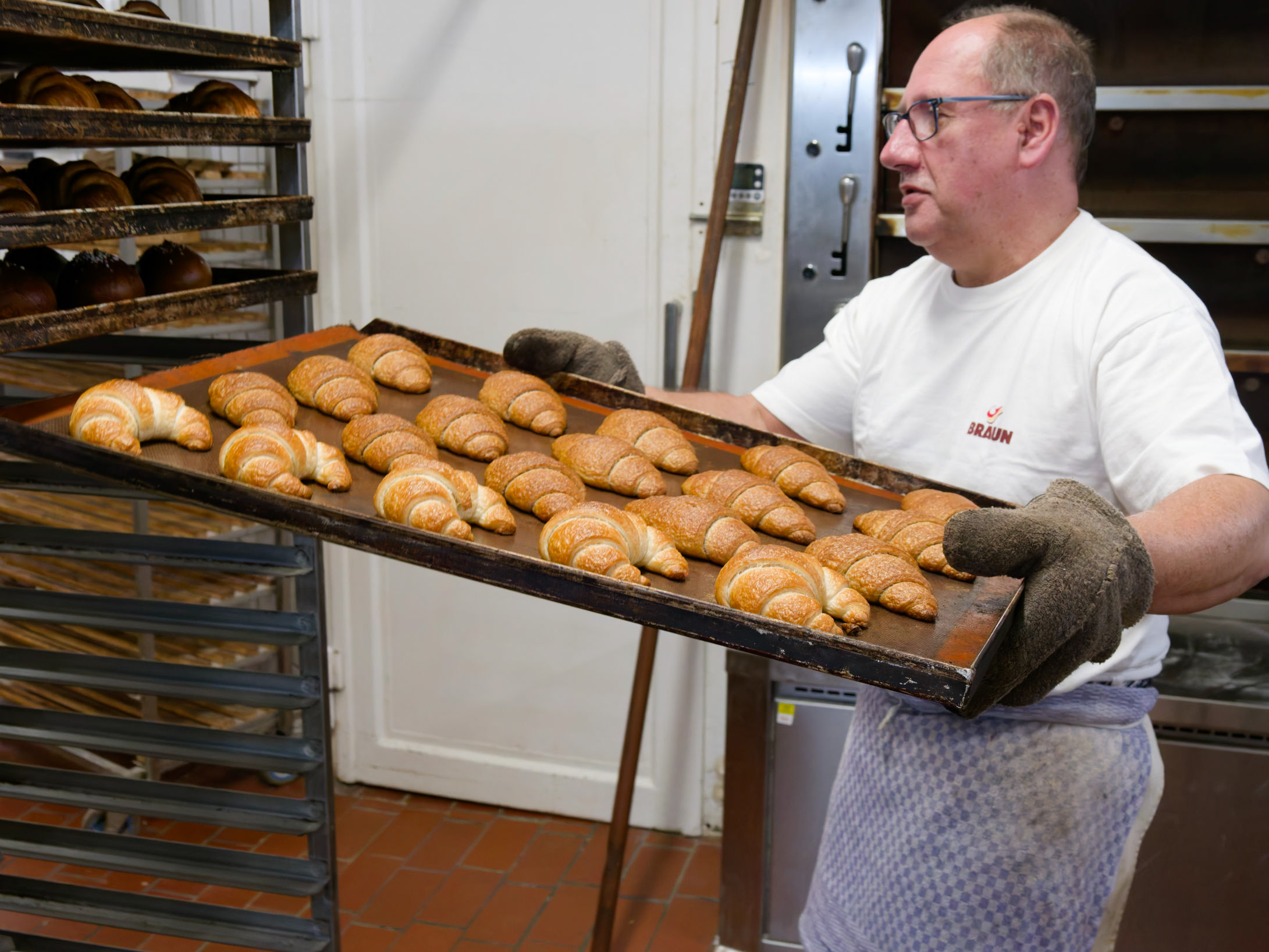 Ein heißes Blech mit frischen Croissants wird in den Bäckereiwagen geschoben.
