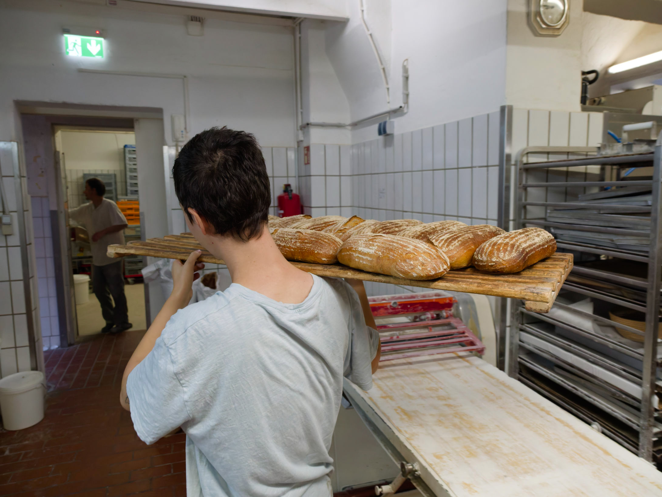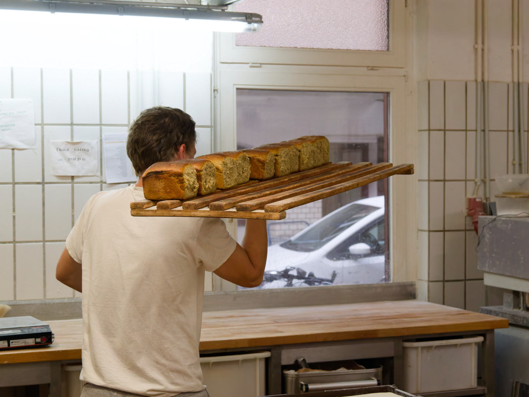 Ein Regalbrett mit Brotlaiben wird in das Ladengeschäft gebracht. Es liegt überm Hof.