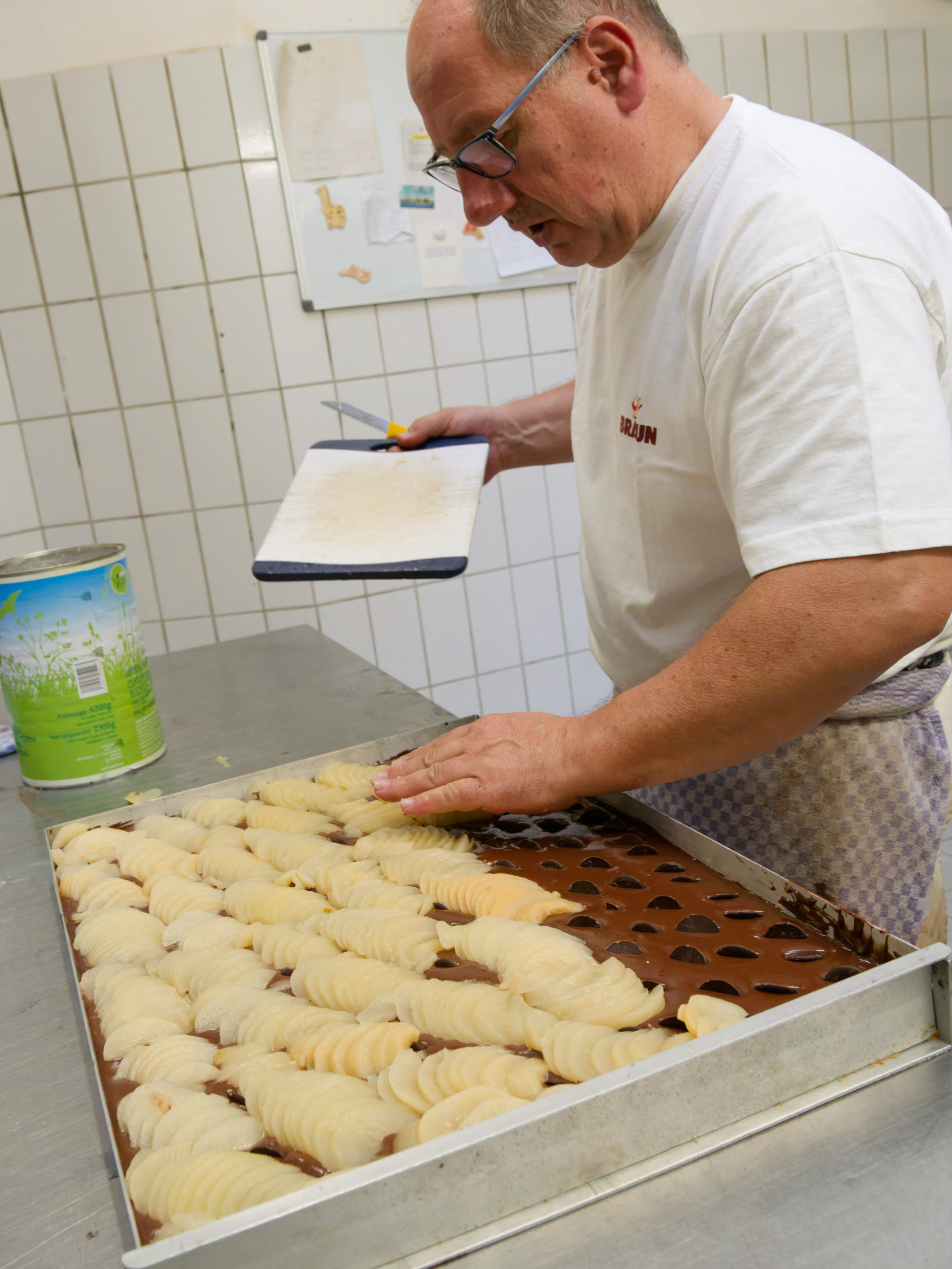 Die Birnen werden auf den Schokoladenteig aufgebracht.