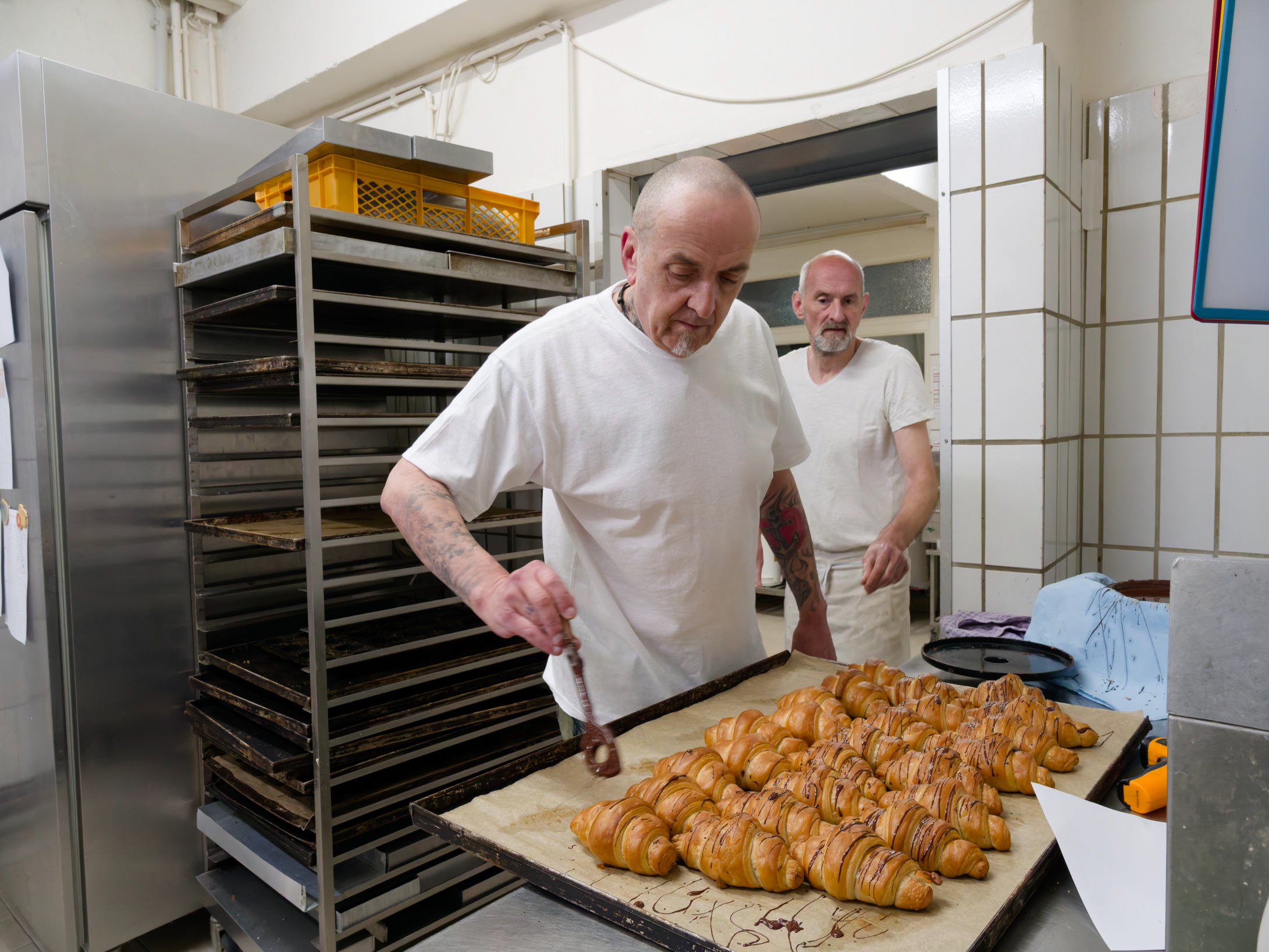 Die Schokoladencroissants werden dekoriert.