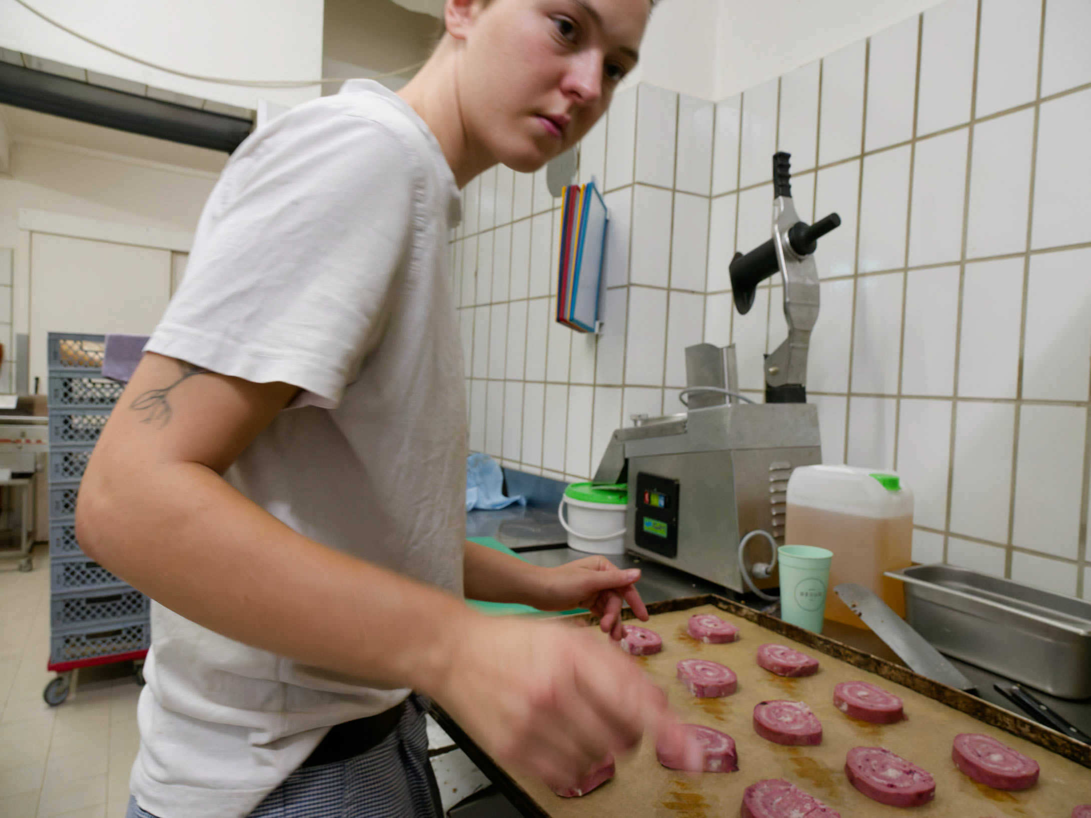 Ein heißes Blech mit Käsebrötchen wird zum Abkühlen in den Bäckereiwagen geschoben.