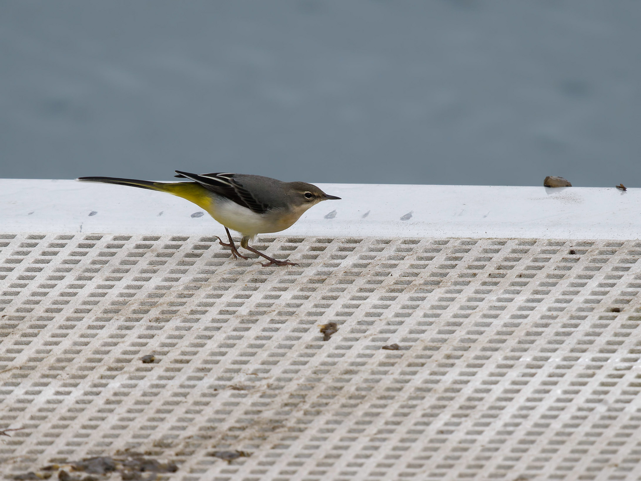 Gebirgsstelze, ein Insekt beobachtend. Gesehen auf einem Ponton im Nordosthafen