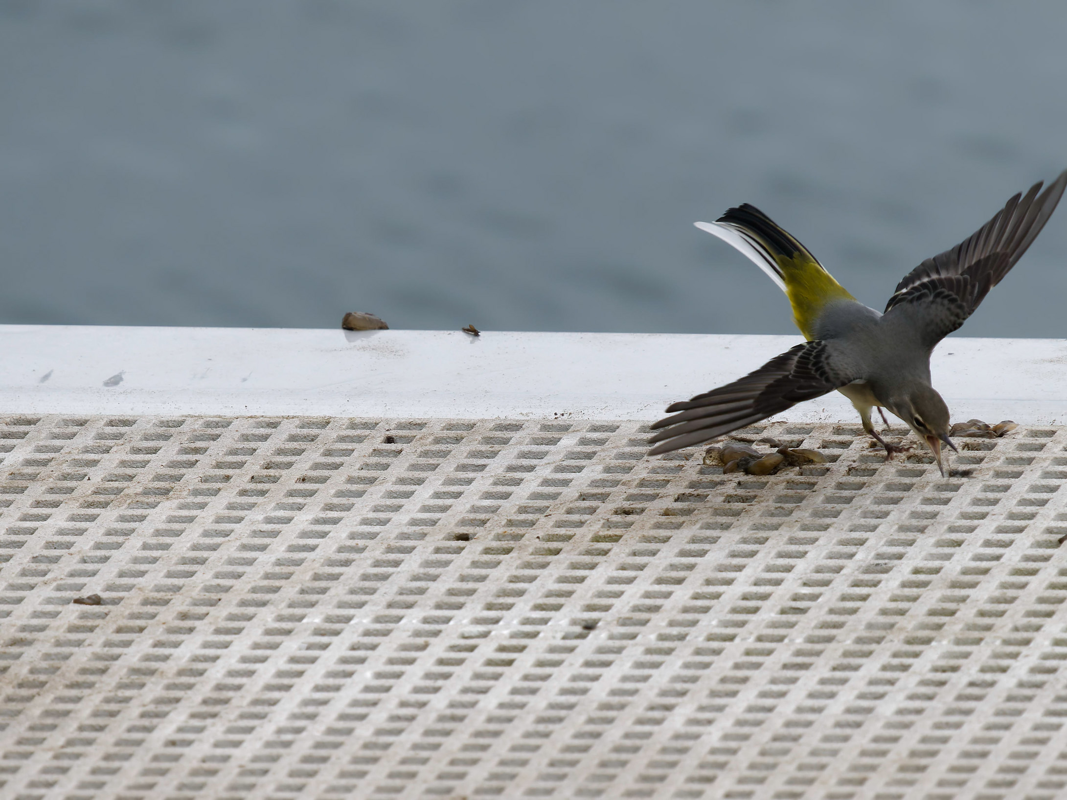 Gebirgsstelze, kurz davor ein Insekt zu verschlingen. Gesehen auf einem Ponton im Nordosthafen